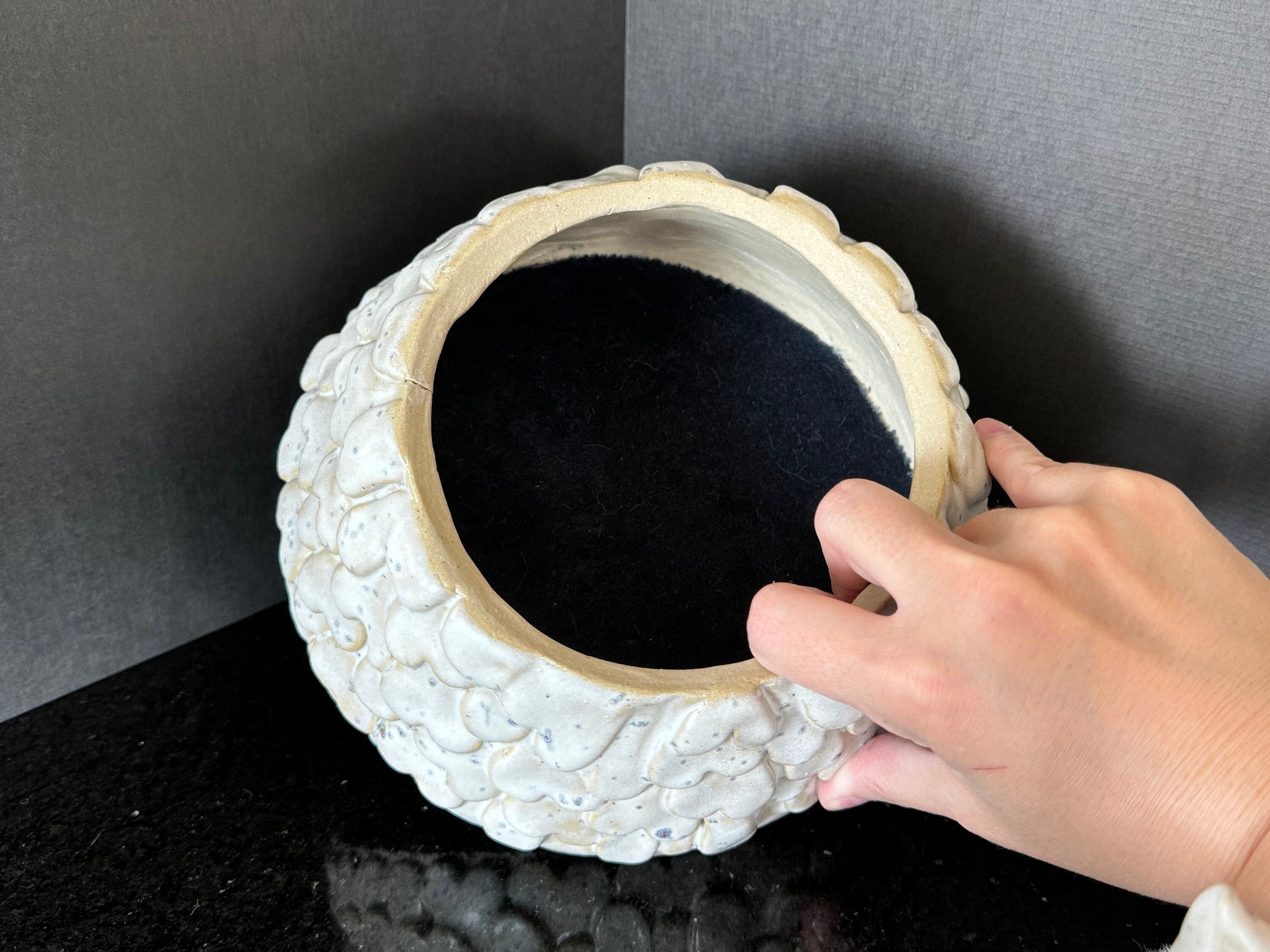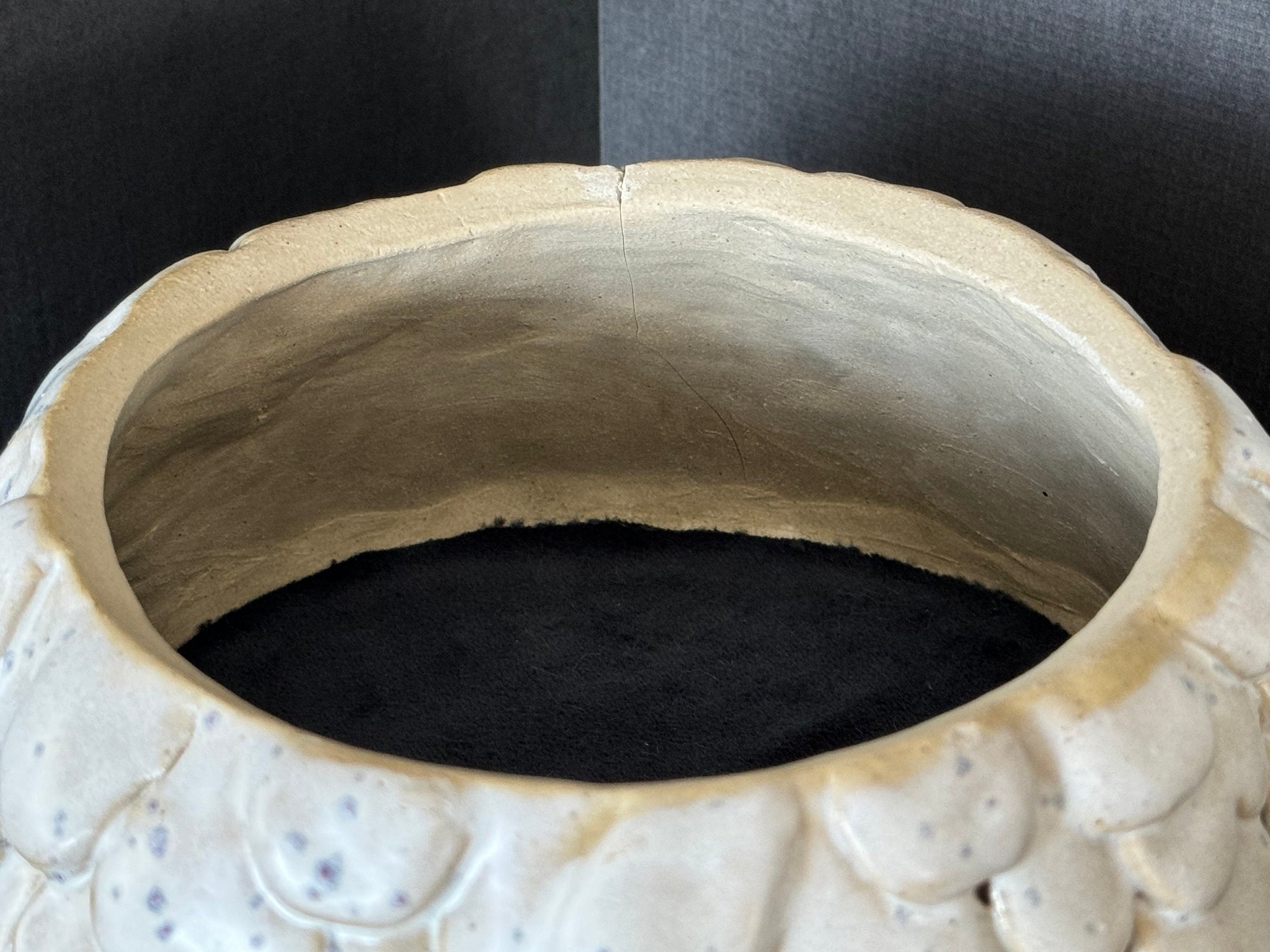 Hand crafted ceramic monster with super soft furry details. Matte off white glaze with purple and blue crystal details throughout, interior base is a dark blue velvet and the exterior base is a soft beige fabric. Use as a unique sculpture in your home as is, or hide your treasures inside.