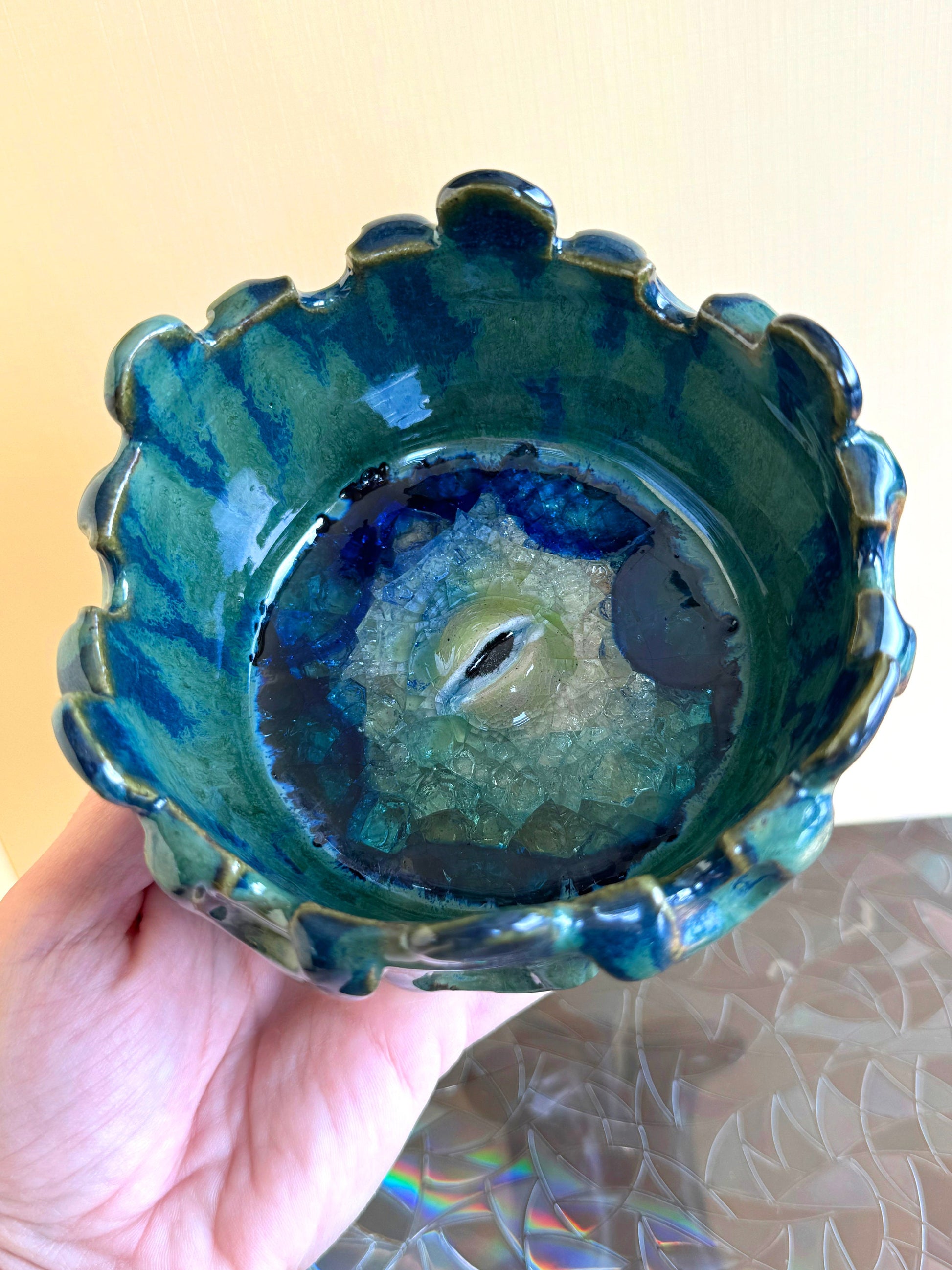 Hand crafted ceramic monster with oozy green and blue glaze, with a super cool crackled colored glass interior and an eye peeking through. Very cool effect going on! Use as a unique sculpture in your home as is, a fun dish, or plant.
