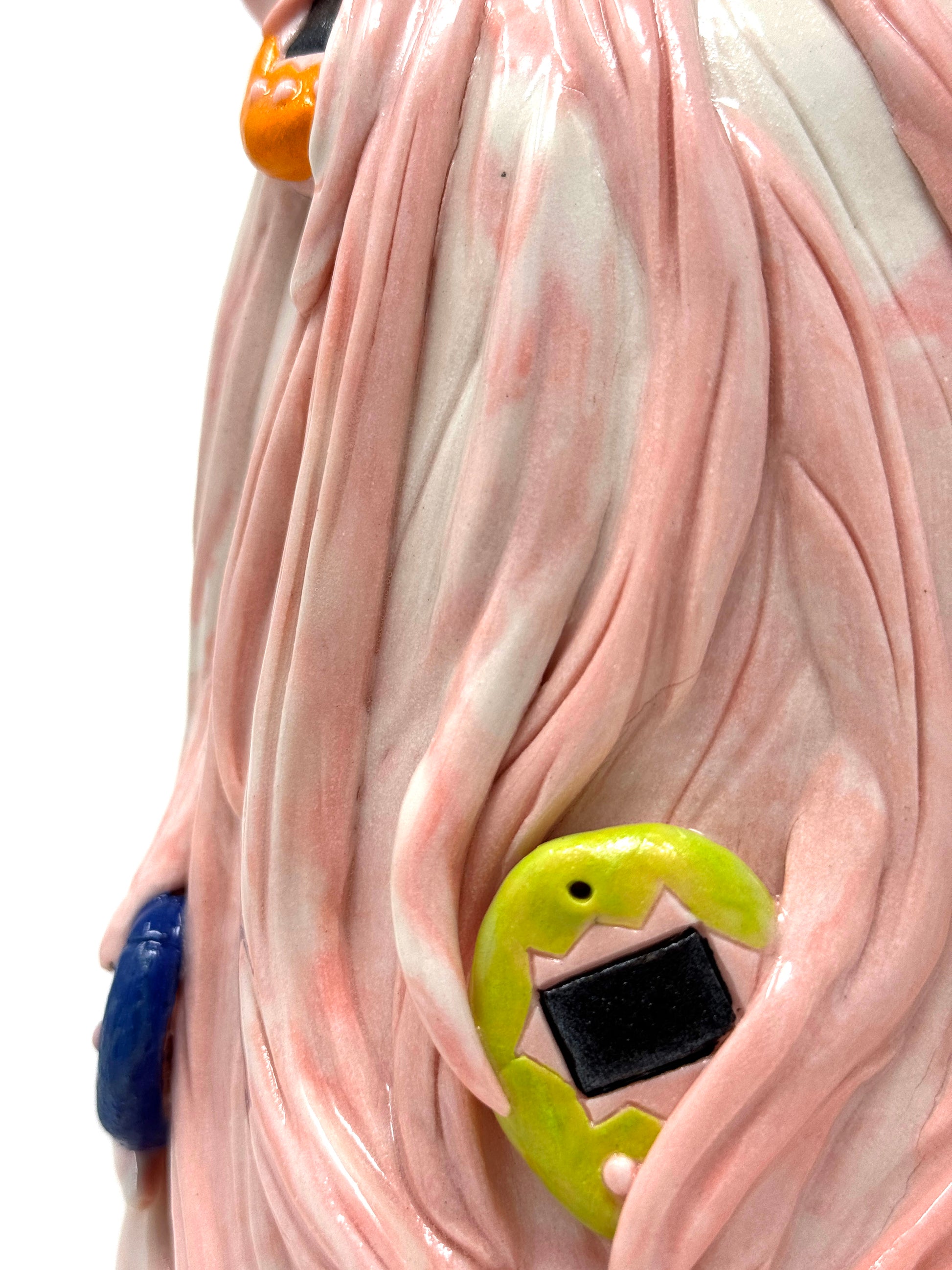 Marbled porcelain, gold lustre accents, kintsugi face details.